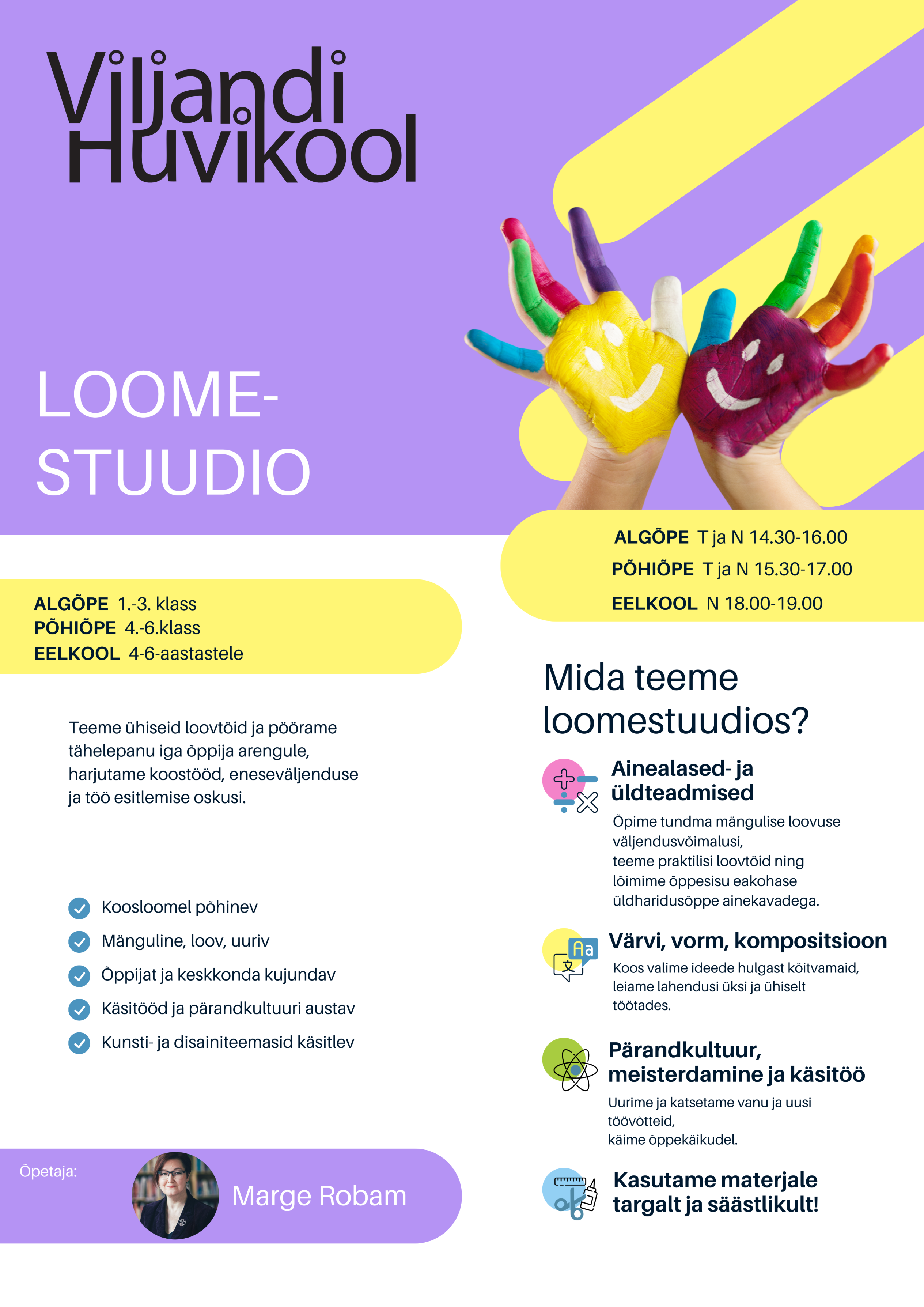 Viljandi Huvikooli loomestuudios omandatakse kunsti- ja disainivaldkonna algteadmisi eakohaselt toetatud õppetegevustes, lähtudes pädevuste arengu toetamisest ning Rohelise kooli põhimõtetest.