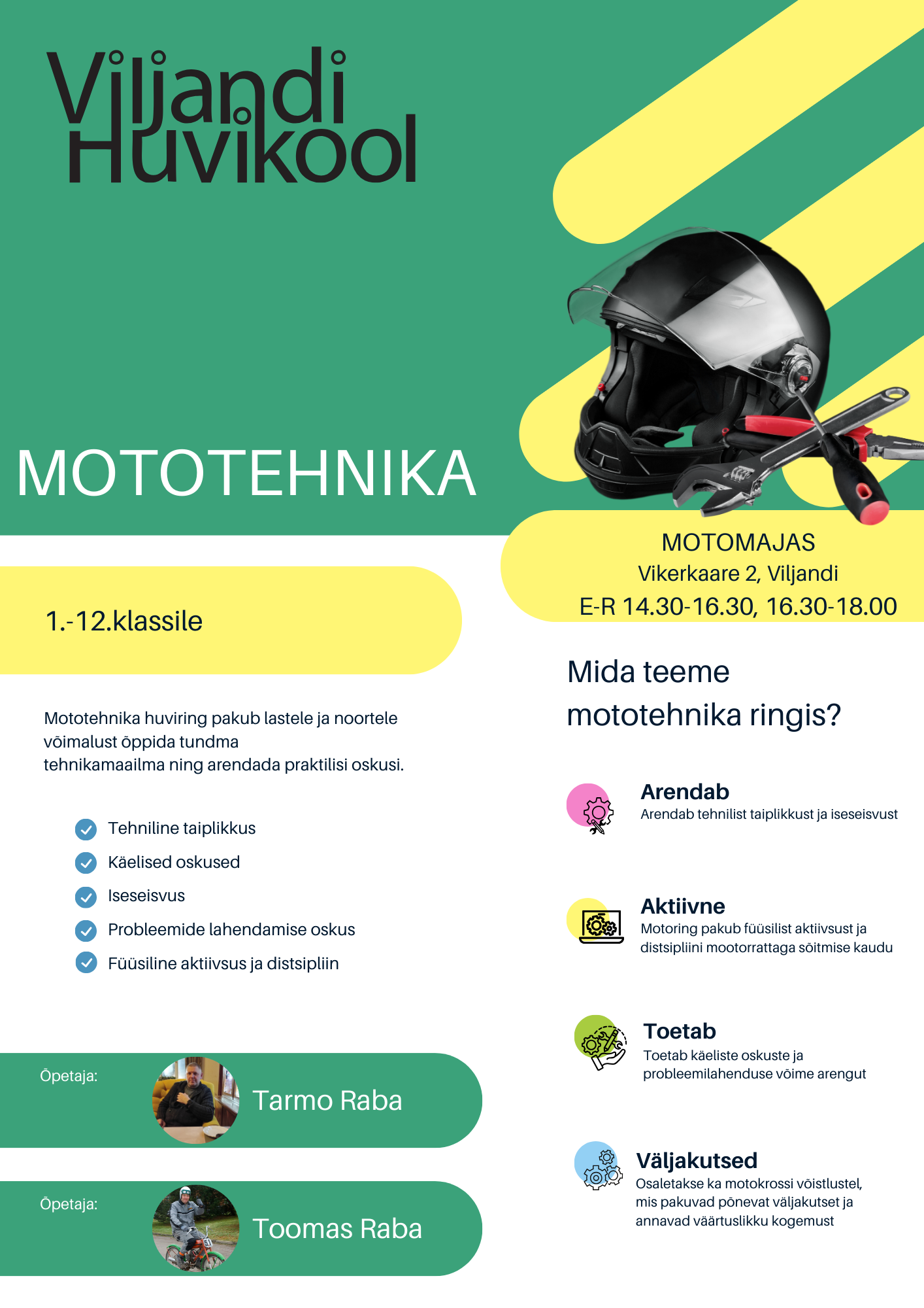 Tunnid toimuvad Viljandi Huvikooli motokeskuses, Vikerkaare 2 (Decora kaupluse taga).