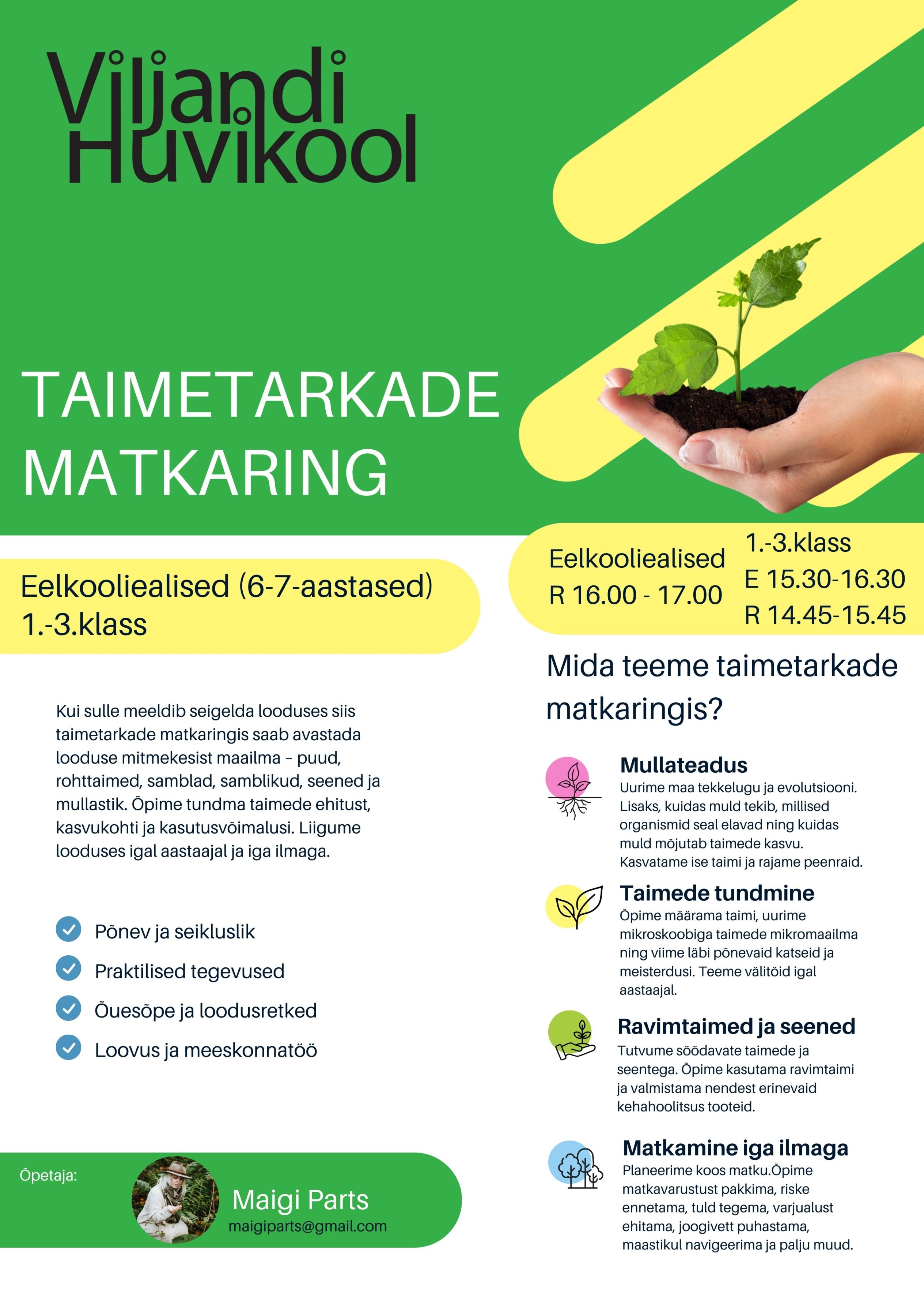Õpime määrama puid nii suvel kui talvel, uurime mikroskoobiga taimede mikromaailma, seemneid, teeme põnevaid katseid ja meisterdusi. Retkedel tutvume söögi- ja ravimtaimedega ning õpime neid kasutama. Lisaks õpime märkama ja eristama samblaid ja samblike. Seeneriigis tutvume nii söödavate kui ka mürgiste liikidega.