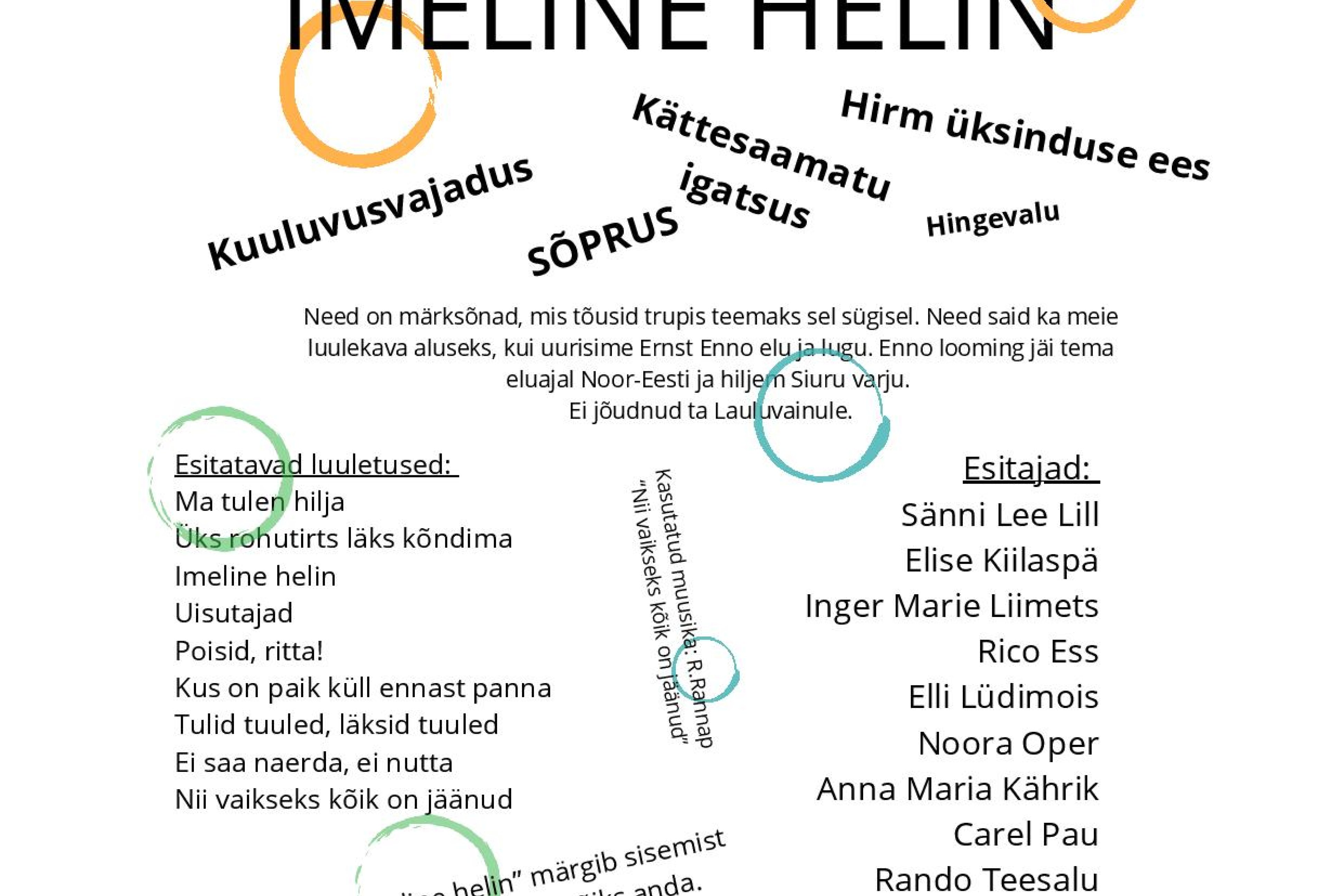 Teatriklass esines luulekavaga "Imeline helin". Läbi Ernst Enno luule mõtiskleti kuuluvusvajaduse, sõpruse, igatsuse, üksinduse ja hingevalu teemadel. Luulekava nimiteos "Imeline helin" kujutab sisemist häält, mis meile rõõmu ja jõudu võiks anda. Sisehääle kuulamiseks on aga vaja julgust ja järjepidevust.