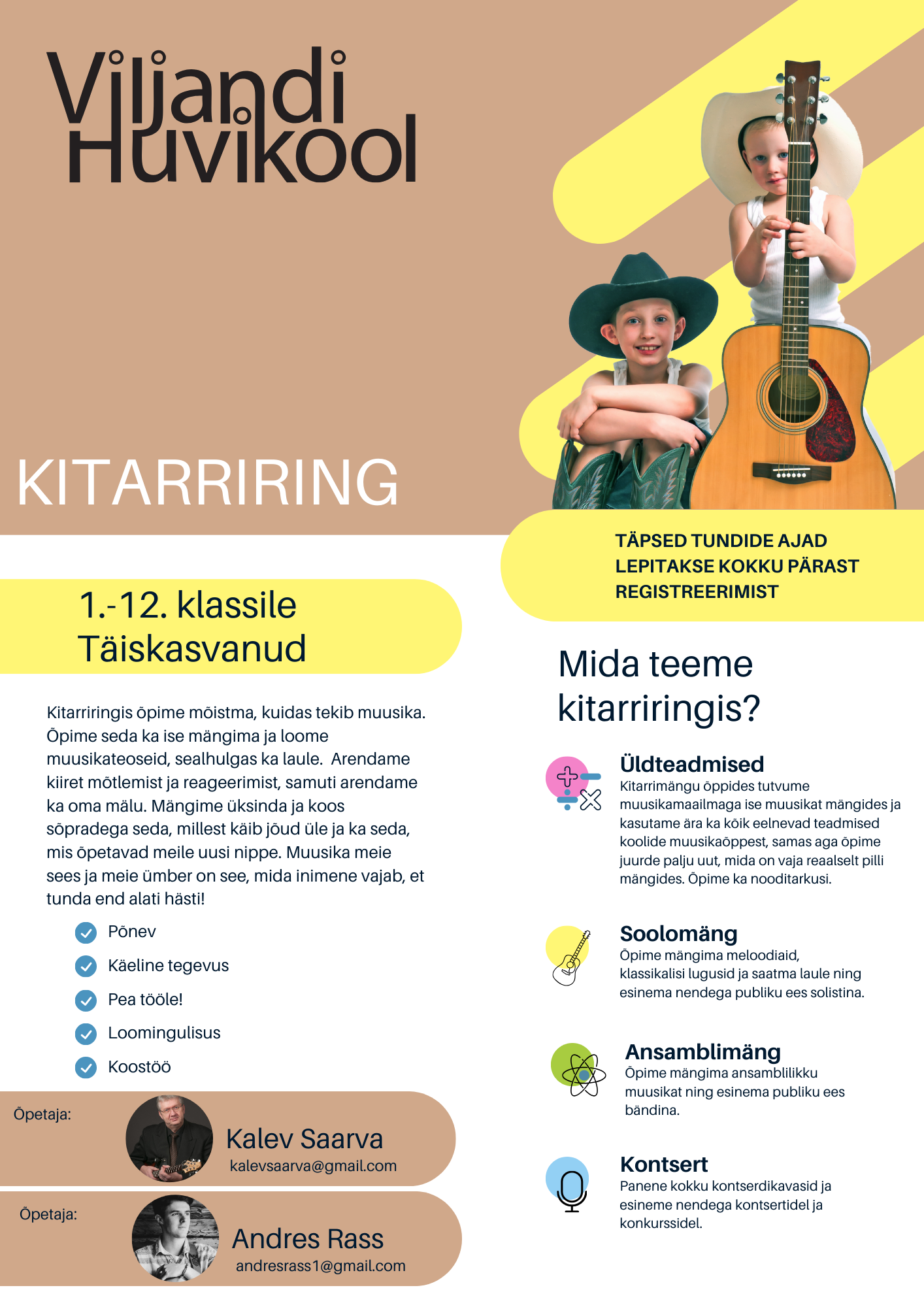 Kakskümmend kolm aastat aktiivselt töötanud ja kunagi isegi kogu Viljandimaa suurimaks huviringiks tunnistatud Viljandi Huvikooli kitarriringis on aastate jooksul õppinud juba üle 680 noore. Kõik, kes on soovinud, on saanud just siin tunda end Hendrik Sal Sallerina, Karl-Erik Taukarina, Ed Sheeranina või kasvõi Justin Bieberina, sest me õpime lugusid, mis õpilastele meeldivad ja neid kõnetavad. Sellise muusika mängimine aitab noortel seada end tuntud Eesti ja maailma tähtede kõrvale ja tunda end nende seas. Loomulikult on meie töös tähtis osa ka omaloomingul.