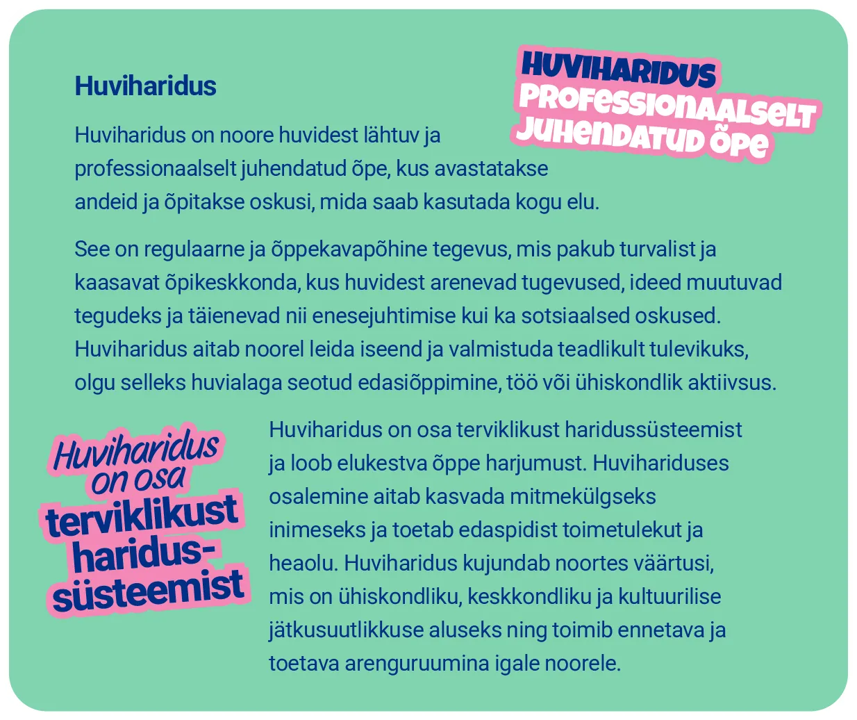 Kui huvialade valikul on suunad käes, küsi lapselt, kuhu ta oma huvialadel unistab jõuda. Kui soovite leida meelepärast tegevust vaba aja veetmiseks, siis kaaluge huvitegevusi üldhariduskoolide, noortekeskuste ja huvikeskuste tegevuste seast. Huvialaga süvendatult tegelemiseks valige huvikoolide poolt pakutavate õppevõimaluste seast.