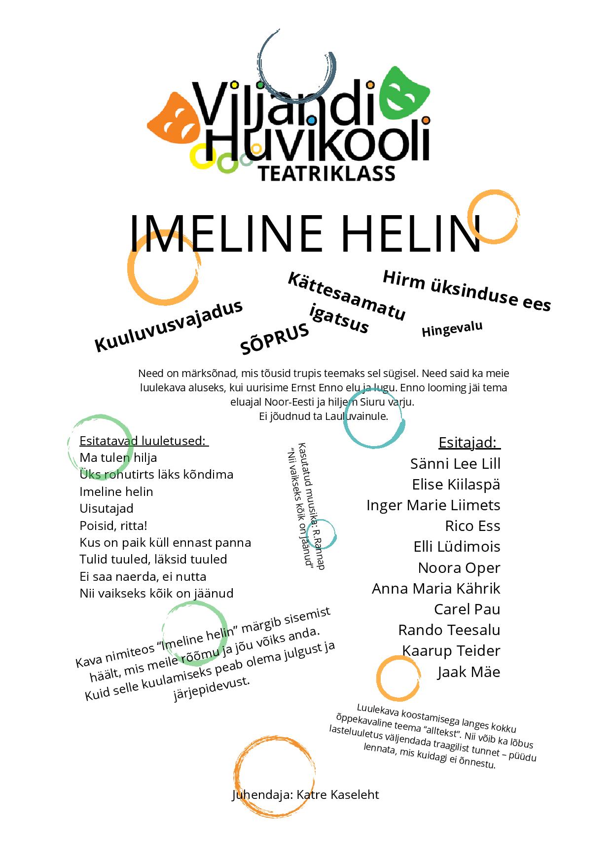 Teatriklass esines luulekavaga "Imeline helin". Läbi Ernst Enno luule mõtiskleti kuuluvusvajaduse, sõpruse, igatsuse, üksinduse ja hingevalu teemadel. Luulekava nimiteos "Imeline helin" kujutab sisemist häält, mis meile rõõmu ja jõudu võiks anda. Sisehääle kuulamiseks on aga vaja julgust ja järjepidevust.